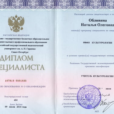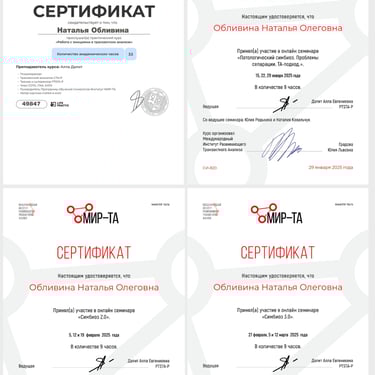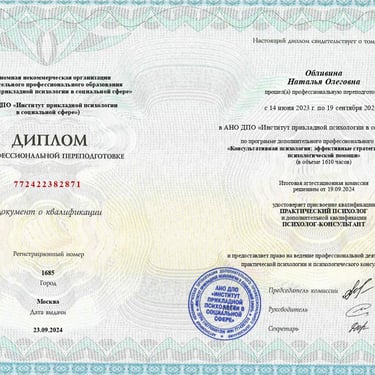 Профессиональную базовую переподготовку я прошла в АНО ДПО «Институт прикладной психологии в социальной сфере». В модальности «Транзактный анализ» я завершила официальный курс 101 и в настоящее время являюсь студенткой Международного института развивающего транзактного анализа «МИР‑ТА», где обучаюсь на курсе 202 у Аллы Евгеньевны Далит. Параллельно прохожу различные курсы, семинары и тренинги, которые помогают мне совершенствоваться в своей работе.